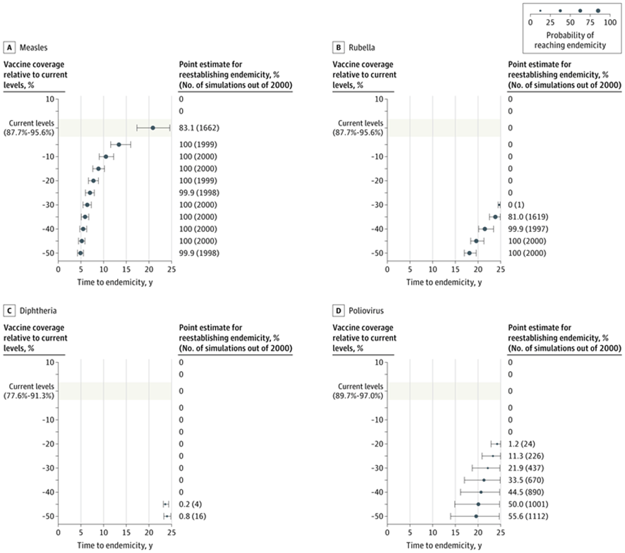 Según las estimaciones de este estudio de modelado, la disminución de las tasas de vacunación infantil aumentará la frecuencia y la magnitud de los brotes de infecciones prevenibles mediante vacunación previamente eliminadas, lo que eventualmente conducirá a su retorno a niveles endémicos. El momento y el umbral crítico para el retorno a la endemicidad variarán sustancialmente según la enfermedad; es probable que el sarampión sea el primero en volver a niveles endémicos y podría ocurrir incluso con los niveles actuales de vacunación sin una mejor cobertura de vacunación y respuesta de salud pública. Estos hallazgos respaldan la necesidad de continuar la vacunación infantil de rutina con una alta cobertura para prevenir el resurgimiento de enfermedades infecciosas prevenibles mediante vacunación en los EE. UU.