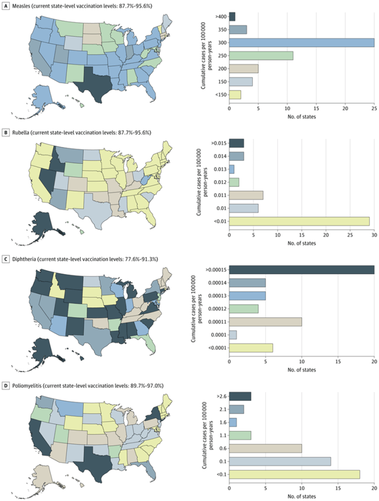 Figura 4. Heterogeneidad a nivel estatal en la incidencia acumulada de sarampión, rubéola, difteria y poliovirus ante una disminución del 25 % en la vacunación infantil de rutina a lo largo de 25 años en los EE. UU.
