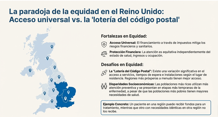 RESULTADOS: El Servicio Nacional de Salud destaca por su eficiencia administrativa y por brindar un acceso equitativo a la atención médica. Sin embargo, enfrenta desafíos como la disparidad geográfica en la disponibilidad de servicios y la percepción de falta de financiación. Suiza invierte comparativamente más en atención médica, pero ofrece resultados superiores. Surgen problemas para brindar una atención equitativa a todos los ciudadanos, lo que afecta especialmente a las poblaciones de bajos ingresos e indocumentadas.