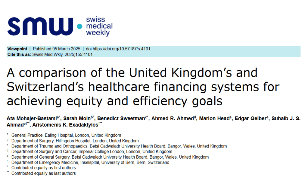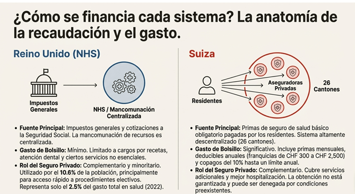 Se compararon los sistemas de financiación de la salud en el Reino Unido y Suiza, priorizando la eficiencia y la equidad. El Servicio Nacional de Salud del Reino Unido emplea el modelo Beveridge. Se financia principalmente mediante impuestos y su objetivo es proporcionar atención médica gratuita en el punto de atención. El sistema de financiación de la salud en Suiza se basa en el modelo Bismarck. Este modelo de seguro social de salud se estructura en torno a planes de salud obligatorios para todos los residentes.