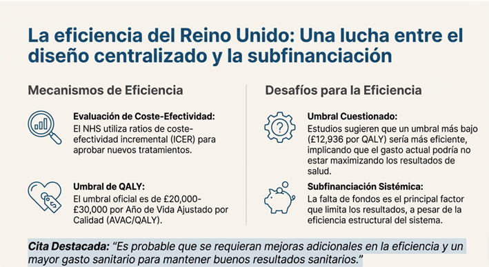 El sistema de financiación de la salud del Reino Unido permite la eficiencia estructural mediante la mancomunación de fondos procedentes de los impuestos generales y las cotizaciones a la Seguridad Social. Este enfoque centralizado reduce los costes administrativos en relación con los ingresos recaudados [12], como lo demuestra un análisis que clasificó al Reino Unido como el segundo sistema de salud más eficiente entre 19 países económicamente desarrollados [43].