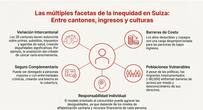 Un sistema descentralizado tiene otras implicaciones para alcanzar los objetivos de equidad sanitaria. Determinantes de salud más amplios, como los factores culturales y socioeconómicos, pueden influir en el consumo de salud. La cultura sanitaria en Suiza suele fomentar una mayor autonomía y responsabilidad de las personas respecto a su propia salud, así como la toma de decisiones sobre su atención. Este modelo orientado al consumidor puede, por lo tanto, generar desigualdades, ya que existen niveles desproporcionados de alfabetización sanitaria y de recursos financieros, lo que agrava las desigualdades sanitarias [62].