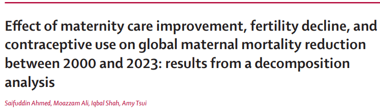El número de muertes maternas a nivel mundial se ha reducido un 41%, de 443 000 en 2000 a 260 000 en 2023. La reducción de la mortalidad materna es posible mediante la mejora de la atención materna, que reduce el riesgo por nacimiento, y la disminución del número de embarazos, lo que a su vez reduce la exposición de las mujeres a los riesgos de mortalidad asociados. Nuestro objetivo fue examinar los efectos de la mejora de la atención materna, la reducción de la fertilidad y el aumento del uso de anticonceptivos en la disminución de la mortalidad materna entre 2000 y 2023.
