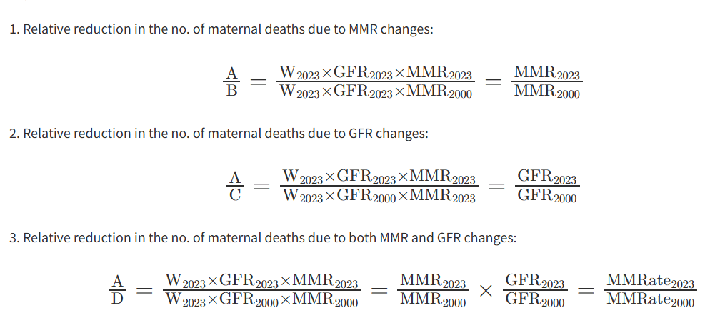 Mostramos a continuación que los RR de las tasas de mortalidad materna (TMM) entre los dos períodos de 2000 y 2023 muestran esencialmente el efecto de los cambios en la fecundidad y la disminución de la TMM en el número de muertes maternas evitadas. Considérese,A.