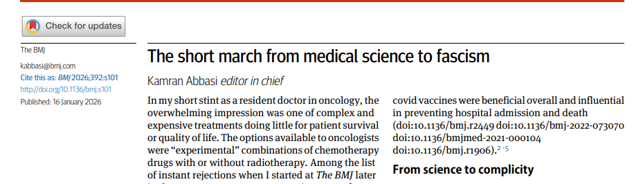 Gavin Yamey y Jonathan Shaffer están indignados porque el desmantelamiento de la salud pública por parte del régimen estadounidense —del cual las vacunas son una parte importante— está siendo ayudado e instigado por poderosos médicos que “dan un aire de credibilidad a políticas dañinas” (doi: 10.1136/bmj.s19 ). 9 La acusación es que los médicos en puestos de autoridad sobre los servicios de salud y la ciencia médica son poco más que vasallos de Donald Trump y Robert F. Kennedy Jr.