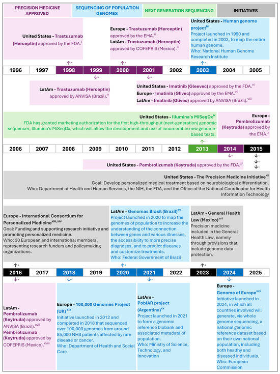 La cronología de los hitos clave en medicina de precisión y genómica en Estados Unidos, Europa y Latinoamérica evidencia la importancia de contar con organismos regionales que supervisen y promuevan el avance y la adopción de la medicina de precisión. Mientras que en la Unión Europea los avances impulsan simultáneamente a varios países, en Latinoamérica los logros suelen ser aislados y corresponden a pocos países. Hasta el momento, no existe una iniciativa de alcance regional comparable en Latinoamérica, lo que subraya el valor de fomentar la colaboración y el desarrollo de estrategias comunes para avanzar en la medicina de precisión en la región.