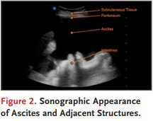 Escanear las vistas del cuadrante superior derecho, superior izquierdo y pélvicas tanto en los planos sagital como transversal para asegurarse de que el paciente tenga líquido libre y que ningún líquido visible esté contenido en estructuras. Un ceco dilatado; quistes en el riñón, hígado u ovarios; hidronefrosis; y una vejiga agrandada puede dar la falsa apariencia de ascitis. Estas colecciones fluidas suelen tener un aspecto redondeado. A continuación, escanea los cuadrantes inferiores del abdomen. Encuentra el mejor sitio para la paracentesis identificando puntos clave de la ecografía, incluyendo el tejido subcutáneo, el peritoneo, la ascitis y los órganos abdominales (Fig. 2).