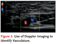 Utiliza imágenes Doppler de potencia o color y coloca el transductor en una orientación transversal hacia la vaina recta de la pelvis, ajustando la caja de color para cubrir el área desde la piel hasta el peritoneo. Ajusta la configuración de la máquina para detectar bajo caudal. Sujeta el transductor quieto. Cuando se utiliza imagen Doppler en color, puede que sea necesario inclinar ligeramente el transductor para detectar el flujo, lo cual puede pasar por alto si el transductor se coloca perpendicular al vaso. Ajusta la ganancia de color para detectar cualquier recipiente subyacente. Primero aumenta la ganancia, luego baja la ganancia lentamente hasta que desaparezca cualquier ruido de señal. Una vez que los recipientes sean claramente visibles, mueve el transductor y utiliza los mismos ajustes para escanear el sitio de paracentesis elegido en varios planos. Si detectas vasos, elige un sitio alternativo. Asegúrese de que el sitio seleccionado esté al menos 2 cm lateralmente a la vaina recta en el cuadrante inferior derecho o izquierdo para evitar perforar los vasos epigástricos inferiores. Marca el lugar deseado con un bolígrafo quirúrgico o aplica una presión suave y sostenida hacia abajo con el extremo de una tapa de aguja para marcar el lugar. Limpia el gel e indica al paciente que permanezca quieto después de que se haya marcado el lugar. Si no hay un transductor de alta frecuencia disponible, se puede realizar una evaluación de los recipientes con un transductor de baja frecuencia, aunque la sensibilidad para identificar los recipientes puede ser menor. Paracentesis Antes de comenzar el procedimiento, realiza un tiempo de espera para confirmar el paciente, el procedimiento y el lugar de inserción de la aguja correctos. Confirme la cantidad de líquido que se debe extraer y prepárese para realizar una infusión de albúmina y pruebas diagnósticas según se indique. Obtén un conjunto base de signos vitales. Realiza la higiene de manos antes de abrir y preparar el botiquín, y prepara el lugar de la inserción de la aguja con una solución antiséptica adecuada. Ponte equipo de protección personal, incluyendo mascarilla, protección ocular y guantes estériles. Una bata estéril es opcional. Coloca la cortina estéril fenestrada sobre el sitio de inserción de la aguja previsto. Asegúrate de tener un campo estéril suficiente para realizar el procedimiento. Prepara entre 5 y 10 ml de anestesia local. Utilizando una aguja de calibre pequeño, como una de calibre 22, 25 o 27, eleva una aguja bajo la piel y luego dirige la aguja más profundo, aspirando mientras avanzas para asegurarte de que la aguja no esté en un vaso sanguíneo antes de inyectar anestesia local. Puede ser necesaria una aguja ligeramente más larga y de calibre 22, como una aguja de calibre 22, para infiltrarse en los tejidos más profundos hasta el peritoneo. Cuando el líquido se aspira en el catéter, inyecta algunos adicionales de la Figura 3. Uso de imágenes Doppler para identificar la vasculatura. Todos los derechos reservados, incluidos los de minería de texto y datos, entrenamiento de IA y tecnologías similares. mililitros de solución anestésica en el peritoneo altamente sensible y retirar la aguja. Para pacientes con tejido adiposo considerable o anasarca, puede ser necesaria una aguja de punción lumbar con el estilete retirado. Después de asegurarse de que la piel está bien anestesiada, realiza una pequeña incisión de menos de 5 mm de ancho en la piel con un bisturí para facilitar la inserción del catéter. Ajusta la longitud de la hoja insertada para que la incisión sea lo suficientemente grande para que pase el catéter; La incisión nunca debe superar la profundidad desde la piel hasta el peritoneo indicada en la ecografía. Para bisturís con longitudes ajustables, ajusta la longitud de la hoja para que la incisión tenga menos de 5 mm de ancho. Esta pequeña incisión minimiza la presión necesaria para avanzar el catéter hacia el peritoneo. Una presión excesiva puede disminuir el espacio entre el peritoneo y el intestino y puede aumentar el riesgo de complicaciones. Utilizando el catéter sobre el complejo de agujas unido a una jeringuilla, inserta la aguja mientras se aplica presión negativa sobre la jeringuilla. Cuando encuentres líquido ascítico, avanza la aguja entre 1 y 2 mm más para asegurarte de que el catéter se introduce completamente en el peritoneo. Manteniendo la jeringuilla estable, avance completamente el catéter sobre la aguja hacia la cavidad peritoneal (Fig. 4).