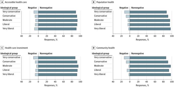 En todos los grupos ideológicos, las reacciones negativas fueron poco comunes en lo que respecta a la atención médica accesible , la inversión en atención médica , la salud de la población y la salud comunitaria : menos del 10% de los encuestados expresaron reacciones negativas en la mayoría de los grupos ( Figura 2 ). Aunque las respuestas generales fueron en gran medida neutrales o positivas, los encuestados muy conservadores expresaron reacciones negativas más altas a la salud de la población (12,3% [IC del 95%, 5,8%-18,8%] frente al 8,9% [IC del 95%, 5,0%-12,8%] para los encuestados conservadores al 2,8% [IC del 95%, 0-5,9%] para los encuestados muy liberales; P = .008) y la salud comunitaria (13,5% [IC del 95%, 6,7%-20,2%] frente al 8,6% [IC del 95%, 4,8%-12,5%] para los encuestados conservadores al 2,2% [IC del 95%, 0-5,0%] para los encuestados muy liberales; P < .001).