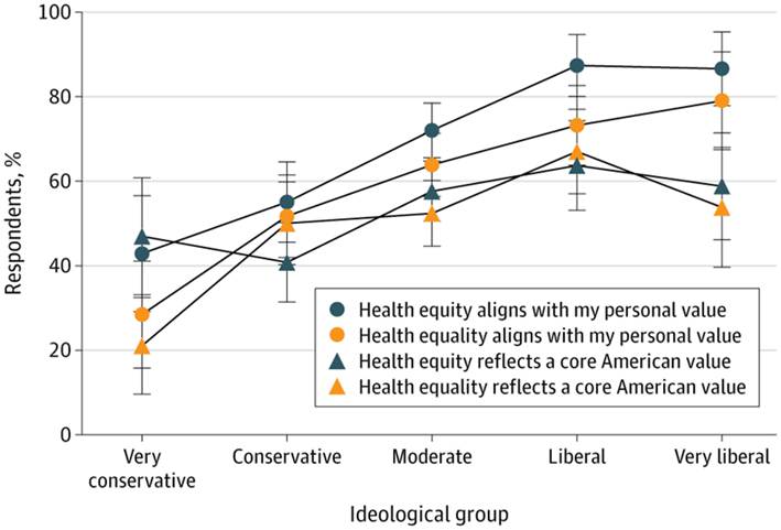 Cuatro términos que describen la equidad en salud recibieron una acogida favorable o neutral: atención médica accesible , salud poblacional , inversión en atención médica y salud comunitaria . La mayoría de las respuestas fueron positivas en todos los grupos ideológicos.