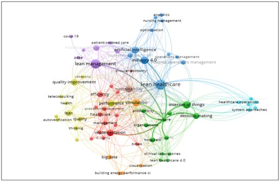 Figura 7. Mapa de red de conceptos clave relacionados con Lean Healthcare, tecnologías de la Industria 4.0 y sistemas de salud sostenibles.