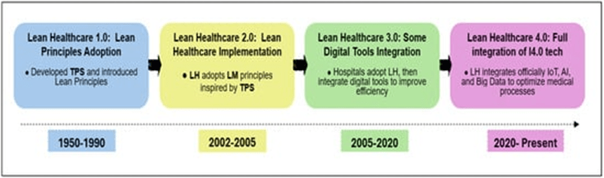 La evolución progresiva de LH, desde TPS hasta la fase actual de digitalización, se ilustra en la Figura 1. El campo ha pasado de la adopción de prácticas lean industriales a la integración de herramientas digitales en salud, marcando hitos en la transformación de los sistemas médicos.