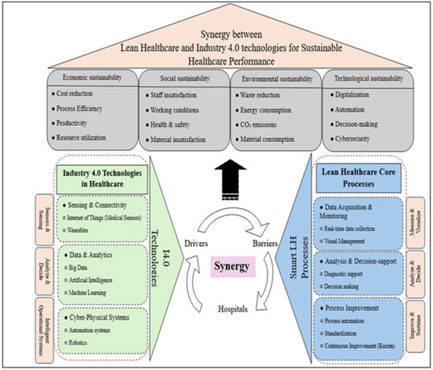 La integración de tecnologías LH-I4.0 mejora los sistemas de salud, incrementando eficiencia, calidad asistencial, flujo de trabajo y satisfacción de personal y pacientes, así como la resiliencia de las instalaciones. La combinación de IA, IoT y Big Data permite una implementación de LH robusta, centrada en la reducción de desperdicio, optimización de recursos y mejora continua. Las herramientas avanzadas validan procesos críticos como monitorización en tiempo real, toma de decisiones, automatización y simulación. Esta sinergia sostiene la sostenibilidad en dimensiones económica, social, ambiental y tecnológica.