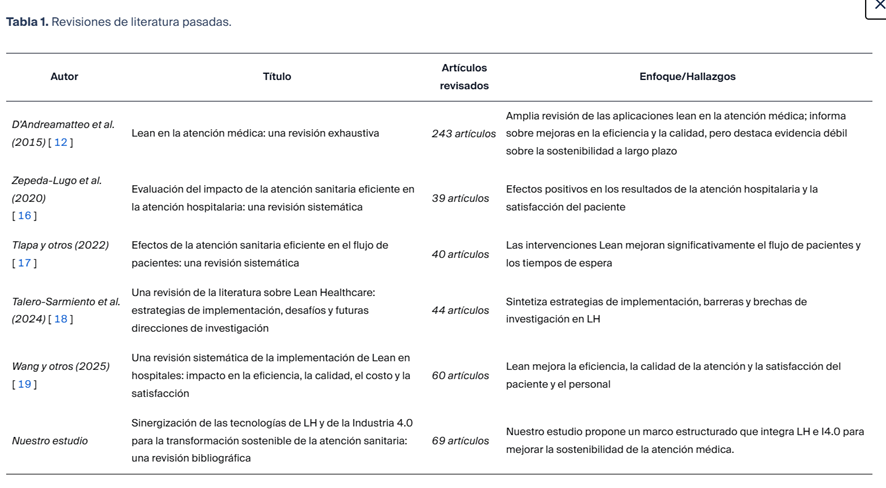 Aunque existen revisiones previas sobre mejoras en el flujo de pacientes y en la implementación de estrategias médicas (Tabla 1), el análisis de la integración LH–I4.0 y su impacto en sostenibilidad es aún limitado. Para avanzar hacia sistemas de salud sostenibles y de alto rendimiento, es necesario un análisis exhaustivo que aclare la sinergia entre LH y las tecnologías digitales. La literatura actual está fragmentada, con escaso análisis empírico y comparativo sobre la interacción LH-I4.0 y su contribución a la sostenibilidad organizativa y operativa.