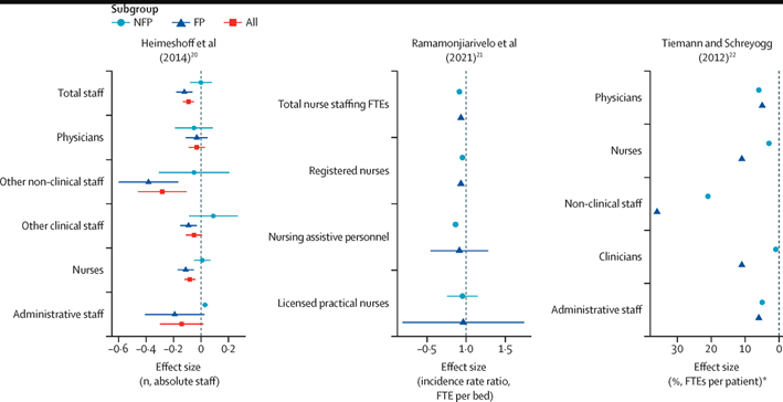 Los estudios evaluaron la dotación de personal como una medida intrínseca de la probable calidad de la atención recibida por los pacientes o en términos de las condiciones laborales del personal. Varios artículos midieron específicamente la diferencia relativa en las tasas de dotación de personal antes y después de la privatización hospitalaria. 20–22 La Figura 2 resume los resultados identificados en estos estudios. En general, los estudios encontraron que la subcontratación se correspondía con un menor número de empleados por paciente. 20–22 Esto también se observó en el personal de limpieza. 30 Sin embargo, el efecto varió según el tipo de personal. Por ejemplo, solo las enfermeras más cualificadas tuvieron un número reducido en los hospitales subcontratados en comparación con los hospitales públicos de EE. UU. 21 En los dos estudios que midieron el número de médicos, este valor no se redujo después de la privatización, mientras que la mayoría de las demás categorías de personal sí lo hicieron. 20,22