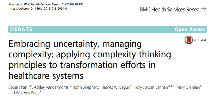 La adopción del pensamiento de la complejidad en los sistemas de salud exige que los actores del sistema trabajen en contra de muchas de las normas estructurales y sociales profundamente arraigadas que prevalecen. Los enfoques comúnmente practicados para brindar y comprender la atención médica se basan en soluciones reduccionistas y en la mayor estandarización posible. Un enfoque basado en los Sistemas Adaptativos Complejos (SAC) para transformar los sistemas de salud requiere una perspectiva conexionista (y potencialmente ascendente), donde el conocimiento es dinámico y difuso, y la mejora de la calidad requiere variabilidad en respuesta a las condiciones locales. Los expertos sugieren introducir el pensamiento de la complejidad en las estructuras existentes «replanteando la complejidad» para otros actores que trabajan en el sistema; en otras palabras, restando importancia a los conceptos abstractos del pensamiento de la complejidad que son tan difíciles de aplicar a sistemas específicos, al tiempo que se alienta a los actores del sistema a «complejizar» su propio pensamiento al aumentar la conciencia sobre la naturaleza sistémica de sus sistemas en relación con elementos como su trabajo, comportamiento y salud.