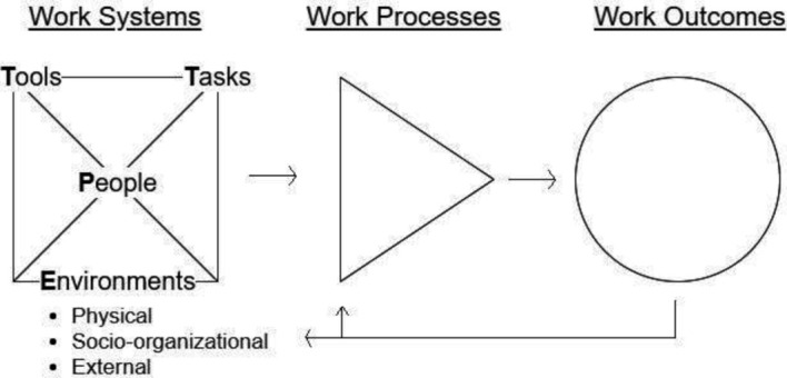 El modelo SEIPS es un modelo teórico basado en la ingeniería de sistemas centrados en el ser humano o «factores humanos / ergonomía». 8 9 Todas las versiones del modelo representan tres componentes principales, el sistema de trabajo, los procesos y los resultados; características o factores clave de cada uno; y cómo los componentes se afectan entre sí. El modelo SEIPS se ha utilizado para comprender o diseñar sistemas sociotécnicos y ha apoyado actividades de evaluación, planificación e investigación. La primera versión del modelo SEIPS fue publicada en 2006 en esta revista por Carayon y sus colegas,1 basado en trabajos que datan de la década de 1980.10–12 La siguiente adición a la familia SEIPS fue SEIPS 2.0, propuesto por Holden et al3 principalmente para abordar el trabajo realizado por pacientes, familias y otros no profesionales. SEIPS 2.0 realizó ampliaciones teóricas al sistema de trabajo, procesos y componentes de resultados e introdujo la herramienta de diagrama configural. 2 SEIPS 3.0 de Carayon et al se publicó posteriormente para elaborar aún más el componente de procesos y promover la atención al viaje del paciente a medida que se desarrolla en el tiempo y el espacio.