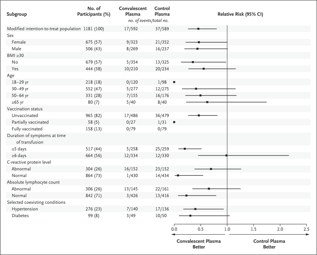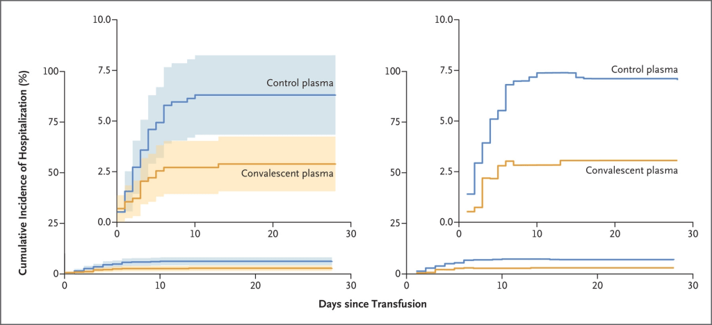Los participantes se inscribieron desde el 3 de junio de 2020 hasta el 1 de octubre de 2021. Un total de 1225 participantes se aleatorizaron y 1181 recibieron una transfusión. En el análisis por intención de tratar (intention-to-treat analysis) modificado preespecificado que incluyó solo a participantes que recibieron una transfusión, el resultado primario ocurrió en 17 de 592 participantes (2,9 %) que recibieron plasma de convaleciente y 37 de 589 participantes (6,3 %) que recibieron plasma de control ( reducción absoluta del riesgo, 3,4 puntos porcentuales; intervalo de confianza del 95 %, 1,0 a 5,8; P = 0,005), lo que corresponde a una reducción del riesgo relativo del 54 %. No se puede inferir evidencia de eficacia en participantes vacunados a partir de estos datos porque 53 de los 54 participantes con Covid-19 que fueron hospitalizados no estaban vacunados y 1 participante estaba parcialmente vacunado.