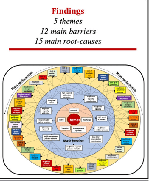 Mejorar los flujos de pacientes hospitalarios como medio para mejorar la productividad requiere un enfoque en todo el hospital (24, 29, 31, 34). Además, la mejora del rendimiento general de un proceso sólo puede lograrse identificando y resolviendo sus principales limitaciones (42, 43). Por lo tanto, en la búsqueda de un chivo expiatorio para los problemas de rendimiento de pacientes en todo el hospital, nuestra revisión revela la complejidad detrás de los procesos de los pacientes en los hospitales y que las barreras y las causas raíz asociadas están entrelazadas y deben abordarse como tales. En total, se han identificado 12 barreras principales y 15 causas fundamentales principales, lo que proporciona un buen punto de partida para los responsables de la formulación de políticas y los administradores de la atención médica en los que realmente deben centrarse los cuellos de botella. La categorización también proporciona un contexto a las causas fundamentales en términos de tipos conectados de barreras y temas basados en el tipo de entorno en todo el proceso de un paciente en todo el hospital. Esto ofrece a los agentes de mejora más posibilidades para identificar la estrategia de mejora más adecuada de acuerdo con las políticas u objetivos específicos de un hospital.