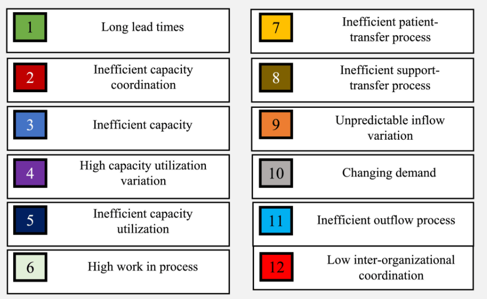 Se han identificado 12 barreras principales y 15 causas asociadas. Los largos plazos de entrega, la coordinación ineficiente de la capacidad y la transferencia ineficiente del proceso del paciente son las barreras de proceso del paciente más frecuentes en los hospitales.