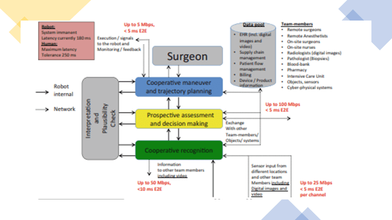 La velocidad máxima teórica de 5G es de hasta 10 Gbps, lo que significa que es cien veces más rápida que 4G cuya velocidad máxima teórica es de 100 Mbps [19]. La incorporación de Internet 5G de alta velocidad con telecirugía reducirá el período de latencia actual de 0.27 a 0.01 segundos [20]. Esta mejora en la latencia puede resolver los problemas de retraso de tiempo que son un problema relacionado con la telecirugía. Además, una red de quinta generación (5G) también permite que una aplicación háptica tome vida [21]. Todas estas mejoras significan que es una tecnología crucial para la cirugía remota.