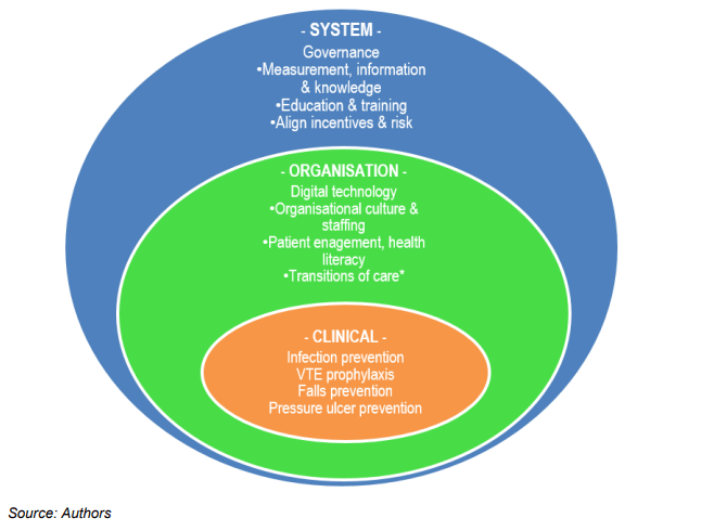 · Es necesaria una mejor alineación de la gestión de riesgos clínicos, corporativos y profesionales en todo el sistema. Actualmente, el impacto total y los costos del daño no se tienen en cuenta en las decisiones sobre la mejora de la seguridad. Además, en sistemas de salud complejos y fragmentados, el impacto profesional y financiero de un lapso de seguridad se siente la mayoría de las veces más a lo largo del viaje del paciente y no donde ocurrió un lapso de seguridad. Mejorar la seguridad será más difícil sin abordar esto.