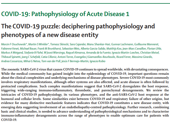 Una visión general de la evidencia actual con respecto a las reacciones inmunoinflamatorias inducidas por el SRAS-CoV-2 y las consecuencias posteriores basadas en órganos sugiere varias conclusiones. En primer lugar, un nuevo perfil infeccioso es evidente: subespecie coronaviridae baja patógena del coronavirus humano, como hCoV-229E, hCoV-OC43 y hCoV-NL63, infectan las vías respiratorias superiores causando enfermedades respiratorias de leve a moderada (similares al resfriado común), mientras que los virus altamente patógenos se asientan en las vías respiratorias inferiores, causando típicamente neumonía grave y ARS. El SARS-CoV-2 comparte características de subespecies de coronavirus bajos y altamente patógenos: después de infectar las vías respiratorias superiores, es capaz de propagarse posteriormente a las vías respiratorias inferiores. Esta dualidad, acompañada de la capacidad de transmisión viral durante el período de incubación, aparece como una ventaja evolutiva y una característica única de este nuevo patógeno coronavirus. En segundo lugar, la infección endotelial y epitelial parece predominar, en lugar de una infección centrada en alveolar: la interrupción de la barrera epitelial-endotelial alveolar es fundamental para el desarrollo de neumonía grave y ARV. En comparación con la gripe y el SRAS, la participación multiorgánica y los eventos tromboembólicos son más comunes en covid-19,100, 130 lo que implica que el SRAS-CoV-2 es un virus endotrofílico. En tercer lugar, la respuesta inflamatoria es atípica: aunque los pacientes con COVID-19 tienen citoquinas proinflamatorias circulantes elevadas durante un período de tiempo más largo que los pacientes con gripe,155 por ejemplo, las concentraciones parecen ser significativamente más bajas que las típicas en ARDS no relacionados con COVID-19.123 Las características inflamatorias observadas hasta ahora en pacientes con COVID-19 sugieren que el componente sistémico de citoquinas no es un contribuyente crucial a la gravedad del COVID-19 o que la enfermedad presenta su propio perfil inflamatorio único, mal entendido, pero perjudicial. En cuarto lugar, una respuesta maladaptiva del huésped es incapaz de combatir el virus: hay una marcada asociación entre las cargas virales altas (local y sistémica) y el fenotipo y la magnitud de la respuesta disregulada del huésped, lo que sugiere que un control deficiente del virus SARS-CoV-2 por la respuesta inmune conduce a covid-19 grave.El concepto de vasculitis pulmonar inducida por el virus es consistente con la falla observada con frecuencia de apoyo ventilatorio simple en pacientes con COVID-19. Por lo general, un desajuste sustancial de V/Q en COVID-19 es más a menudo una consecuencia de la derivación de derecha a izquierda debido a los pulmones inflamados e hiperperactivos y la falla de vasoconstricción hipoxica. Este escenario podría desencadenar un círculo vicioso que comienza con hipoxia y un aumento en el esfuerzo respiratorio y el consumo de oxígeno. Si un paciente con COVID-19 grave no es capaz de satisfacer su demanda de oxígeno mediante la adaptación fisiológica de la salida cardíaca y el contenido de oxígeno, el resultado será fatal. Este concepto podría ayudar a explicar por qué los pacientes mayores y los pacientes con obesidad que han reducido la capacidad pulmonar, y los pacientes con comorbilidades cardiovasculares tienen los mayores riesgos de resultados desfavorables.En conclusión, proponemos que covid-19 debe ser percibido como una nueva entidad con su propia característica y clara fisiopatología. Sin embargo, las diferencias entre ards relacionadas con COVID-19 y ARDS de otras causas (y otras enfermedades críticas) no deben provocar el abandono de los principios de consenso existentes de la atención crítica, como otros señalan.274 Independientemente de si esta noción está confirmada, es aconsejable estudiar fisiopatología COVID-19 sin ideas preconcebidas basadas en otras enfermedades críticas, que podrían ser engañosas para la atención clínica y los tratamientos. Las instrucciones para futuras investigaciones sobre la fisiopatología COVID-19 se proponen en el panel 2. Un conjunto imparcial y gradual de piezas clave en el rompecabezas fisiológico COVID-19 para diferentes cohortes de pacientes (por ejemplo, basado en sexo, edad, etnia, comorbilidades preexistentes), aunque no tan rápido como se desee, eventualmente creará una representación más precisa de la enfermedad.