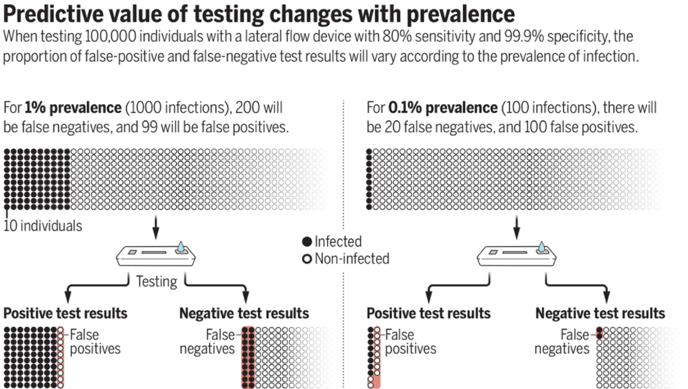 El valor predictivo de las pruebas varía según la prevalencia poblacional de la infección y la fase de la curva epidémica (7). A medida que disminuye la prevalencia de infecciones por SARS-CoV-2, aumenta la proporción de resultados de pruebas falsos positivos, mientras que el número de resultados de pruebas falsos negativos disminuye. Por ejemplo, con un 99,9% de especificidad (proporción de no infecciones que rechaza la prueba) y un 80% de sensibilidad (proporción de infecciones que detecta la prueba), el valor predictivo positivo (proporción de personas con un resultado positivo de la prueba que están infectadas) es del 89% cuando la prevalencia es del 1%, y baja al 44% a una prevalencia del 0,1% (55 de cada 100 resultados positivos de las pruebas son falsos). En términos absolutos, sin embargo, si se prueban a 100.000 personas, estos escenarios darían lugar a 99 falsos positivos (de 899 resultados positivos) y 100 falsos positivos (de 180 resultados positivos) para una prevalencia del 1% y del 0,1%, respectivamente (ver la cifra). Las pruebas confirmatorias de RT-PCR después de un resultado positivo de la prueba LFD fueron reintroducidas recientemente por Public Health England debido tanto a los bajos valores predictivos positivos de las pruebas con baja prevalencia de infección como a la utilidad de reutilizar muestras de PCR para la secuenciación genética viral en la vigilancia de variantes (13).