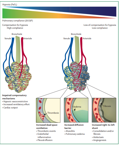 Un fenómeno inusual en COVID-19 en comparación con otras causas de insuficiencia respiratoria es la llamada hipoxemia silenciosa, caracterizada por una PaO2 críticamente baja2 pero sólo molestias respiratorias leves y disnea.55, 56 Un estudio demostró dificultad para respirar en sólo alrededor del 19% de los pacientes que tenían2/FiO2 Cocientes.57 Fisiopatológicamente, la hipoxemia sólo tiene un papel limitado en la sensación de dificultad para respirar,58 pero la respuesta a la baja PaO2 (<60 mm Hg) aumenta el accionamiento respiratorio, definido como la intensidad del estímulo neuronal para respirar a través de la regulación de la frecuencia respiratoria y la profundidad (volumen de marea, VT). Por lo tanto, taquipnea y alta VT (pero no necesariamente disnea) son signos de hipoxia, especialmente en neumonía COVID-19.57, 59 Entender este concepto es fundamental para la gestión clínica; un impulso respiratorio excesivo podría conducir a un mayor deterioro de la función pulmonar en un círculo vicioso de lesiones pulmonares infligidas por el paciente, aunque este concepto sigue siendo controvertido.60 Se han propuesto varias hipótesis para explicar la hipoxia, incluyendo efectos específicos del SARS-CoV-2 sobre la quimiosensitividad del receptor de oxígeno,61 menor capacidad de difusión,62 y pérdida de mecanismos vaso constrictivos hipoxicos.63 De hecho, muchos eventos fisiopatológicos en COVID-19 afectan a perfusión pulmonar (Q) o ventilación (V; ventilación del espacio muerto o formación de derivación de derecha a izquierda), todo lo cual podría conducir a un desajuste V/Q. La alteración de la mecánica pulmonar debido al edema pulmonar progresivo relacionado con inflamación pulmonar sostenida, colapso alveolar, atelectasias y fibrosis afecta aún más la función pulmonar global, lo que resulta en hipoxia de tejido progresivo(Figura 1,Figura 2). Otras señas de identidad de COVID-19 graves son la inflamación endotelial, la neovascularización y los eventos trombóticos