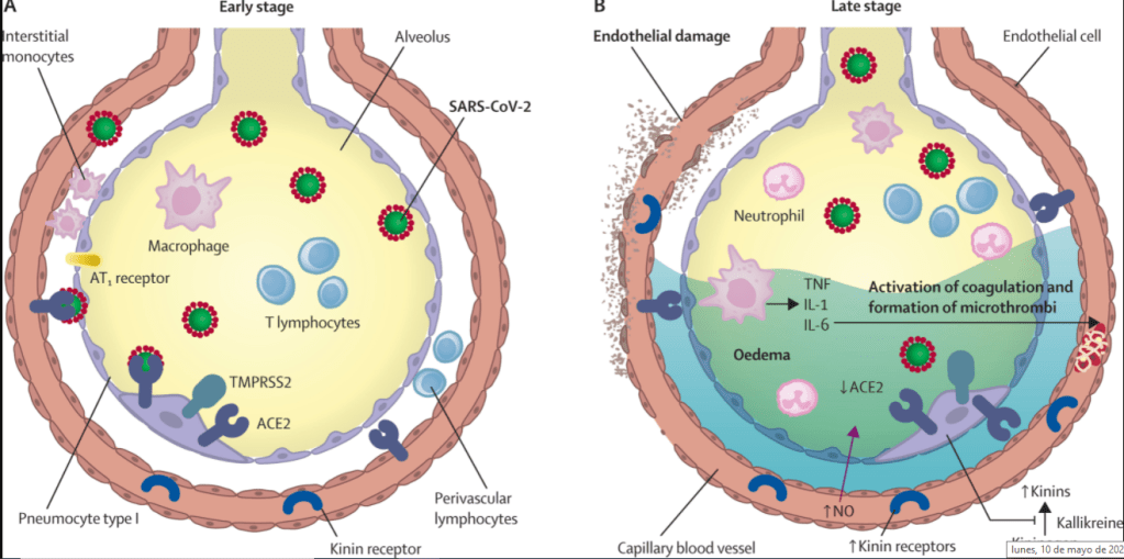 El SRAS-CoV-2 invade células ciliadas en el epitelio superficial de la cavidad nasal.52 Una infección viral difundida con viremia y altas cargas virales en las vías respiratorias en el ingreso hospitalario se asocian con resultados graves,64, 65 aunque no todos los estudios apoyan esta noción.31 A diferencia de los virus de la gripe, que infectan principalmente las células de las vías respiratorias y las células inmunes (macrófagos alveolares e intersticiales y células asesinas naturales), el SRAS-CoV-2 puede infectar una gama más amplia de células, incluidos los cardiocitos y las células endoteliales, testiculares y de vías biliares.66 La glicoproteína de pico viral (S) media la entrada viral mediante la unión a ACE2 en la superficie celular epitelial, un proceso apoyado por la proteasa transmembrana serina 2 (TMPRSS2).67 La expresión ACE2 es alta en las células epiteliales de la cavidad nasal, apoyando una infección inicialmente localizada por el SRAS-CoV-2.52, 67 No está claro cómo se difunde el SRAS-CoV-2 a las vías respiratorias inferiores. Predominan dos teorías: en primer lugar, (micro-)aspiración de partículas SARS-CoV-2 causa propagación desde la orofaringe a los pulmones;68 y en segundo lugar, las micropartículas en el aire se transportan directamente a las vías respiratorias inferiores por flujo de aire, evitando las vías respiratorias superiores.69, 70 Cabe destacar, se ha sugerido la participación de otros receptores (por ejemplo, neuropilina 1) que actúan como co-factores a la entrada celular SARS-CoV-2 y tropismo.71, 72