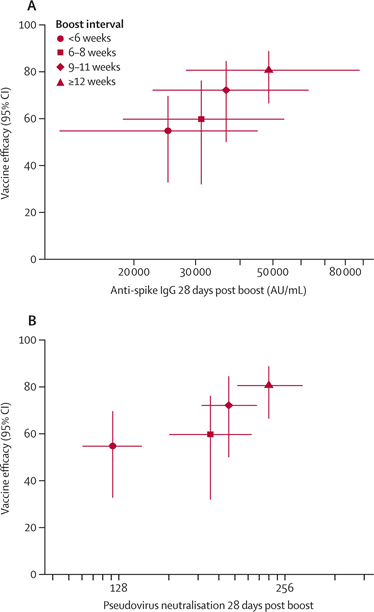 El análisis presentado aquí proporciona pruebas sólidas de la eficacia de dos dosis estándar de la vacuna, que es el régimen aprobado por la MHRA y otros reguladores. Tras la aprobación reglamentaria, una cuestión clave para que los responsables políticos planifiquen el enfoque óptimo para la implantación es el intervalo óptimo de dosis, que se evalúa en este informe mediante análisis exploratorios post hoc. Dos criterios que contribuyen a la toma de decisiones en este ámbito son el efecto del intervalo de impulso de primera en la protección después de la segunda dosis y el grado en que el individuo vacunado está en riesgo de infección durante el período de tiempo anterior a la dosis de refuerzo, si hubo una eficacia reducida con una sola dosis o una disminución rápida de la eficacia antes de la segunda vacunación.En este informe se presentan análisis exploratorios que muestran protección con intervalos de dosificación de menos de 6 semanas a 12 semanas o más y que un intervalo más largo proporciona una mejor protección después de una dosis de refuerzo sin comprometer la protección en un período de 3 meses antes de administrar la segunda dosis.En los análisis exploratorios, una única dosis estándar de ChAdOx1 nCoV-19 tuvo una eficacia del 76·0% (IC 95% 59·3 a 85·9) contra el COVD-19 sintomático en los primeros 90 días después de la vacunación, sin disminución significativa de la protección durante este período. No está claro cuánto tiempo podría durar la protección con una sola dosis porque el seguimiento se limita a los períodos de tiempo descritos aquí y, por esta razón, se recomienda una segunda dosis de vacuna.Una segunda dosis de ChAdOx1 nCoV-19 induce un aumento de los niveles neutralizantes de anticuerpos10, 12 y probablemente sea necesario para una protección duradera. Sin embargo, cuando hay un bajo suministro de vacunas, una política de vacunar inicialmente a una cohorte más grande con una sola dosis podría proporcionar una mejor protección general de la población que vacunar a la mitad del número de individuos con dos dosis a corto plazo. Con la evidencia disponible en este momento, se prevé que todavía se requiere una segunda dosis para potenciar la inmunidad de larga duración. Los modelos recientes de impulso retardado sugieren que incluso en presencia de una disminución sustancial de la eficacia de la primera dosis, los programas que retrasan una segunda dosis para vacunar a una mayor proporción de la población dan lugar a una mayor protección inmediata de la población en general.15En nuestro estudio, la eficacia de la vacuna después de la segunda dosis fue mayor en aquellos con un intervalo de impulso prime más largo, alcanzando el 81·3% en aquellos con un intervalo de dosificación de 12 semanas o más frente al 55·1% en aquellos con un intervalo de menos de 6 semanas. Las estimaciones puntuales de eficacia fueron menores con intervalos de dosificación más cortos, aunque cabe señalar que hay cierta incertidumbre porque las IA se superponen. Se observaron títulos de anticuerpos de mayor unión y neutralización en el sera con el intervalo de impulso primo más largo, lo que sugiere que, suponiendo que haya una relación entre la respuesta inmune humorística y la eficacia, estos podrían ser verdaderos hallazgos y no artefactos de los datos. Se ha observado una mayor eficacia protectora asociada con respuestas inmunes más fuertes después de un intervalo más amplio de impulso principal con otras vacunas como las de la gripe, la enfermedad por el virus del Ebola y la malaria.16, 17, 18 Los hallazgos presentados aquí para la vacuna ChAdOx1 nCoV-19 son coherentes con las recomendaciones de política en diferentes países para utilizar intervalos de dosis de 4 a 12 semanas para esta vacuna.La eficacia ligeramente inferior de la vacuna contra el COVID-19 sintomático del 66·7% después de una dosis de refuerzo parece contraintuitiva en comparación con la eficacia del 76% después de una sola dosis, aunque estas diferencias no son significativas. Los casos incluidos en las estimaciones de dosis únicas se produjeron a principios de año que los incluidos en los análisis posteriores a la segunda dosis, y la intensidad de las epidemias varió en los diferentes países, lo que dificultaba la comparación directa entre sí de las estimaciones de dosis únicas y dos dosis.En nuestro análisis provisional, identificamos una mayor eficacia en un análisis de subgrupos de aquellos que recibieron la dosis baja más el régimen de dosis estándar.4 Esta constatación está respaldada por los resultados de este análisis, aunque estos hallazgos son exploratorios. Con más datos disponibles, demostramos que la mayor inmunogenicidad y eficacia con este régimen podría estar impulsada en parte por el intervalo de dosificación más largo que era una característica de este subgrupo, apoyando aún más la observación de una relación entre el intervalo de dosis y la eficacia en aquellos que recibieron dos dosis estándar. El régimen de dos dosis estándar es preferido operativamente porque es más sencillo administrar la misma vacuna para ambas dosis y porque hay más datos de inmunogenicidad y eficacia para apoyar su uso.Otra cuestión importante es si las vacunas pueden reducir la transmisión y, por lo tanto, combinadas con medidas de distanciamiento físico contribuyen a reducir la transmisión del virus de persona a persona. Aunque los estudios de transmisión no se incluyeron en el análisis, los hisopos se obtuvieron de voluntarios cada semana en el estudio del Reino Unido, independientemente de los síntomas, para permitir la evaluación del efecto general de la vacuna sobre el riesgo de infección, y por lo tanto un sustituto de la posible transmisión posterior. Si no hubiera ningún efecto de una vacuna sobre la infección asintomática (aproximadamente un tercio de las infecciones), se esperaría que
