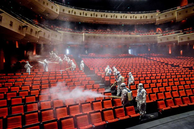 Un equipo que desinfecta el Gran Teatro Qintai en Wuhan, China, en enero. Crédito: Xia Junjun / VCG / Getty
