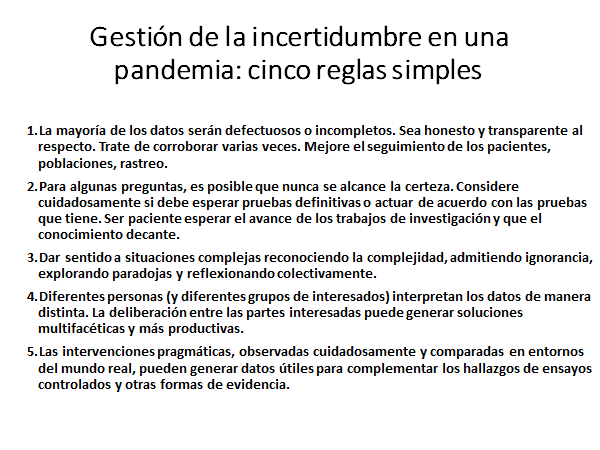 Más del 80% de los pacientes que contraen COVID-19 solo desarrollan síntomas leves similares a los de la gripe. «El sistema inmunitario combate el virus y la gente podría apenas darse cuenta», dice Darrell Ricke, investigador del Grupo de Sistemas y Tecnologías de Bioingeniería del Laboratorio Lincoln del MIT en Lexington, MA, quien publicó una preimpresión en marzo sobre los posibles riesgos de vacunas COVID-19. «Pero parece haber un punto de inflexión: algunas personas parecen igualmente saludables pero pueden progresar a una enfermedad más grave». Algunos pacientes empiezan y rápidamente en la evolución, van al distress, luego hay otro grupo de pacientes que citan estos autores que van a formas graves en el día diez, luego de una etapa de relativa evolución favorable y que inclusive con alguno de esos pacientes pensábamos en generar una transición de cuidados a los hoteles y los domicilios. Cada modificación de un proceso afecta a los que siguen y esto significan nuevas adaptaciones, otros productos, diferentes responsabilidades.