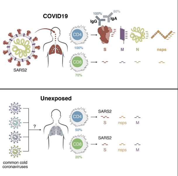 Por lo tanto, es urgente comprender la magnitud y la composición de las respuestas humanas de los células T CD4 y CD8 al SARS-CoV-2. Si la infección natural con SARS-CoV-2 provoca potentes respuestas de células T CD4 y CD8 comúnmente asociadas con la inmunidad antiviral protectora, COVID-19 es un candidato fuerte para el desarrollo rápido de vacunas.