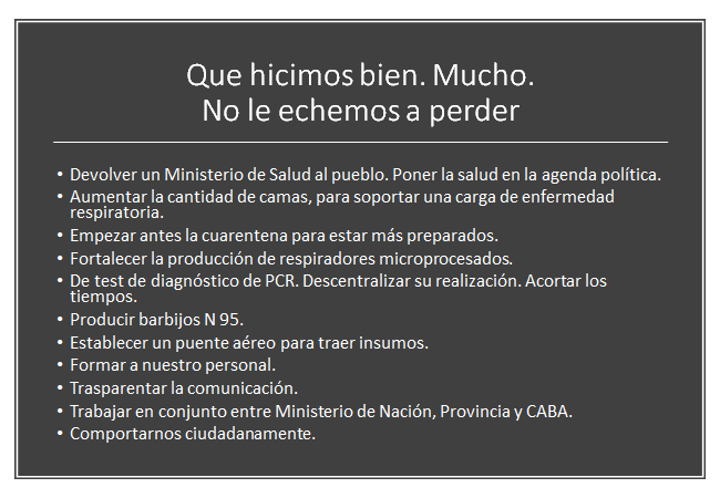 Por último, fortalecer el desarrollo de la telemedicina para el seguimiento posterior de los casos, y con el agregado de la evaluación de los determinantes sociales, de las posibilidades de aislamiento domiciliario o la necesidad del cuidado extrahospitalario, como también la propagación de la infección, en los convivientes con la detección de los casos, en el barrio con las acciones de terreno, en la comunidad con información de todos los actores sociales, y en su lugar de trabajo, trabajando en conjunto con los departamento de medicina laboral de las empresas. También en las áreas más postergadas se requiere una intensa acción de campo coordinada de los rastreadores, para identificar contactos, seguirlos, hisoparlos. El objetivo primero es evitar que progrese el cuadro sin atención, limitar los contagios, identificar si en ese grupo hay asintomáticos, que podrían ser los que propagan sin estar aislados.