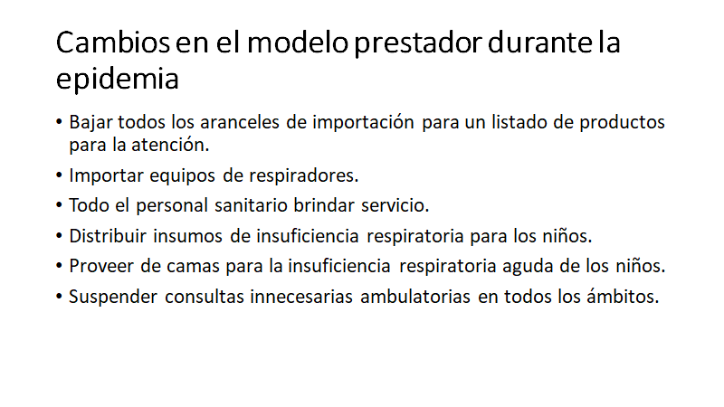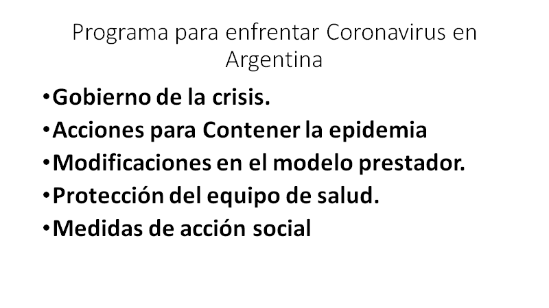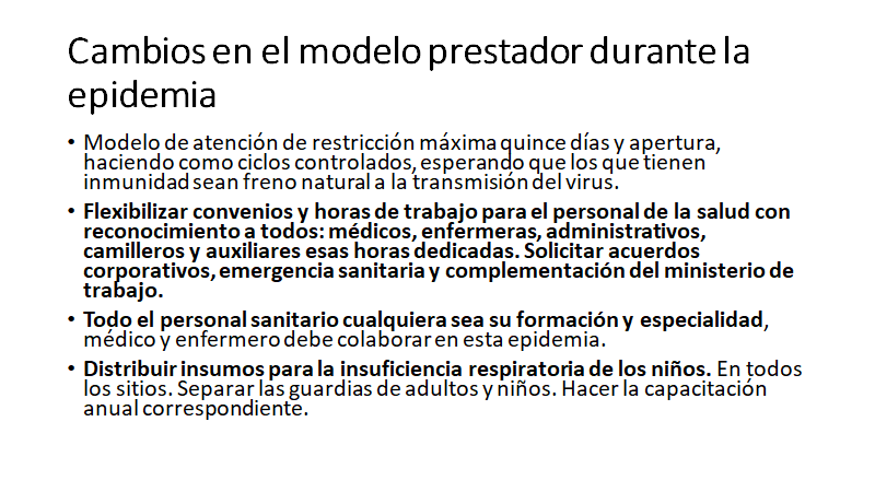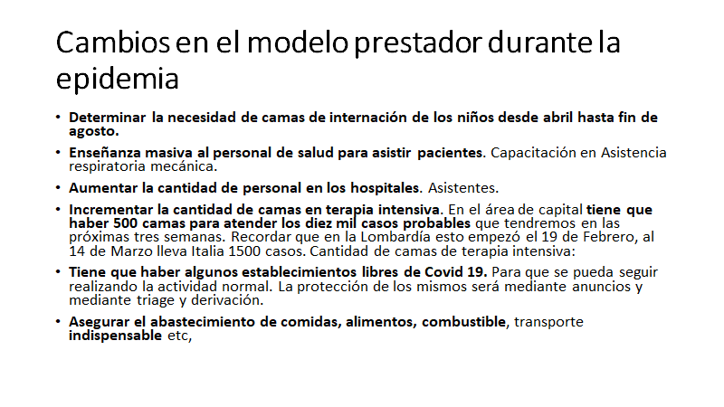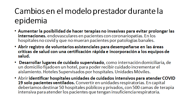 Quisiera expresar que hay que formar recursos, ver personal de otras áreas para capacitar, lo mejor sería concertar con voluntarios, no con cualquiera, asignarles tareas cercanas, funciones de proximidad y que puedan hacer, los cardiólogos es más probable que puedan ser terapistas intensivos, también los anestesistas muy bien formados en las terapias ventilatorias, especialmente si tenemos que usar mesas de anestesia, pero y espero equivocarme, y solicitar disculpas, pero no creo que puedan brindar un servicio a la comunidad, porque han mercerizado mucho su trabajo, siendo los que más cobran, los que siempre cobran, los que si no cobran no prestan, los otros profesionales tienen deudas de varios meses, con valores muy bajos. También podrían brindar un servicio internistas. las personas tienen que entregarse en plenitud, con mística a su vocación, sino no será posible. Tiene que haber un reconocimiento económico para que ese esfuerzo tenga un reflejo en una mejor calidad de vida, no son momentos de reclamos, ni de cuestiones mercantilistas o peseteras, sino de dar desinteresadamente por los necesitados. Es muy difícil saber si se esta haciendo lo correcto. Es muy difícil este momento en la humanidad, volátil, incierto, complejo y ambiguo, porque apareció un cisne negro, el coronavirus, que exige una resiliencia compleja en las organizaciones que viven décadas comportándose como burocracias profesionales, jefes de servicio, de departamento, de sala, divididos por salas o hospitales se necesitan cuidados progresivos. es una enfermedad en vivo, de tiempo presente, que puede aparecer en pocos meses un antiviral que pueda mejorar los resultados, o una vacuna, para inhibir su propagación y asi salir de esta situación de contar muertos, pacientes en asistencia respiratoria mecánica y estudios realizados, de ver desbordados los dispositivos asistenciales o bien desbordes que exigen triage. Cambiar las costumbres, romper las barreras de segmentación, de la fragmentación del sistema de salud argentino, mejorarán los hospitales públicos, se renovarán los respiradores, cambiará la organización de la terapia intensiva, mejorarán los elementos barrera de protección personal, los departamentos de control de infecciones por procedimientos o actos médicos, los cuidados, los sistemas cerrados de aspiración, el abastecimiento de insumos, de medicamentos y esquemas organizativos de trabajo descanso.