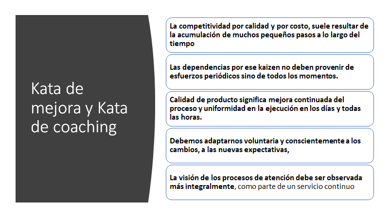 El conocimiento de las kata de mejora proporciona un medio eficaz para evolucionar en grupo, en equipos, un medio para liderar grupos de trabajo, esto puede ser posible porque existe comprensión del objetivo deseado, y es conseguible. Este kata de mejora conlleva enseñar a la gente en forma deliberada y estandarizada para responder científica, humanamente y en valores, con seguridad, comodidad y confianza, contemplando las situaciones de la vida cotidiana asistencial con soluciones respaldadas a los problemas corrientes.