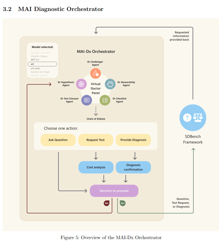 Además, se introduce el MAI Diagnostic Orchestrator (MAI-DxO), un sistema diseñado para simular un panel de médicos y optimizar los diagnósticos mediante estrategias específicas como la selección de pruebas de alto valor y bajo costo. Este sistema, combinado con modelos avanzados como OpenAI o3, alcanza una precisión diagnóstica del 85,5%, superando tanto a médicos humanos como a otros modelos comerciales en términos de precisión y rentabilidad. En general, MAI-DxO logra reducir costos diagnósticos en un 20% en comparación con médicos y hasta un 70% en comparación con modelos estándar, demostrando el potencial de los sistemas de IA orquestados para mejorar tanto la precisión como la eficiencia en el ámbito clínico.