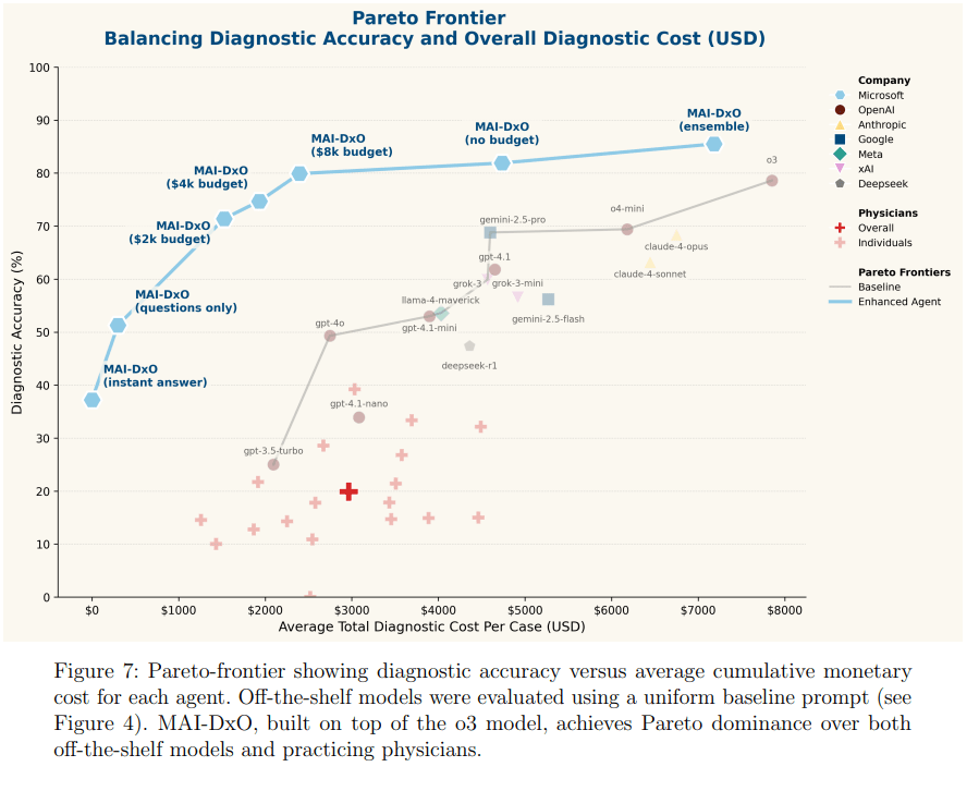 Una vez que se presenta un diagnóstico final, evaluamos su exactitud en comparación con el diagnóstico real y calculamos el costo acumulado estimado en el mundo real de todas las pruebas diagnósticas solicitadas. Al medir tanto la precisión diagnóstica como el costo, SDBench se alinea con los objetivos del Triple Objetivo (Berwick et al., 2008), que busca brindar atención de alta calidad a un costo sostenible. Una cohorte de médicos de EE. UU. y el Reino Unido con una mediana de 12 años de experiencia logró una precisión del 20% a un costo promedio de $ 2,963 por caso en SDBench, lo que subraya la dificultad inherente del punto de referencia. Los modelos comerciales listos para usar mostraron diversas compensaciones: GPT-4o logró una precisión del 49,3% a un costo menor (2.745 dólares por caja), mientras que o3 alcanzó una precisión del 78,6% a un costo sustancialmente mayor (7.850 dólares por caja). Además, presentamos MAI Diagnostic Orchestrator (MAI-DxO), un sistema orquestado diseñado conjuntamente con médicos que supera sistemáticamente tanto a los médicos humanos como a los modelos de lenguaje comerciales a lo largo de la frontera de Pareto de coste-precisión.