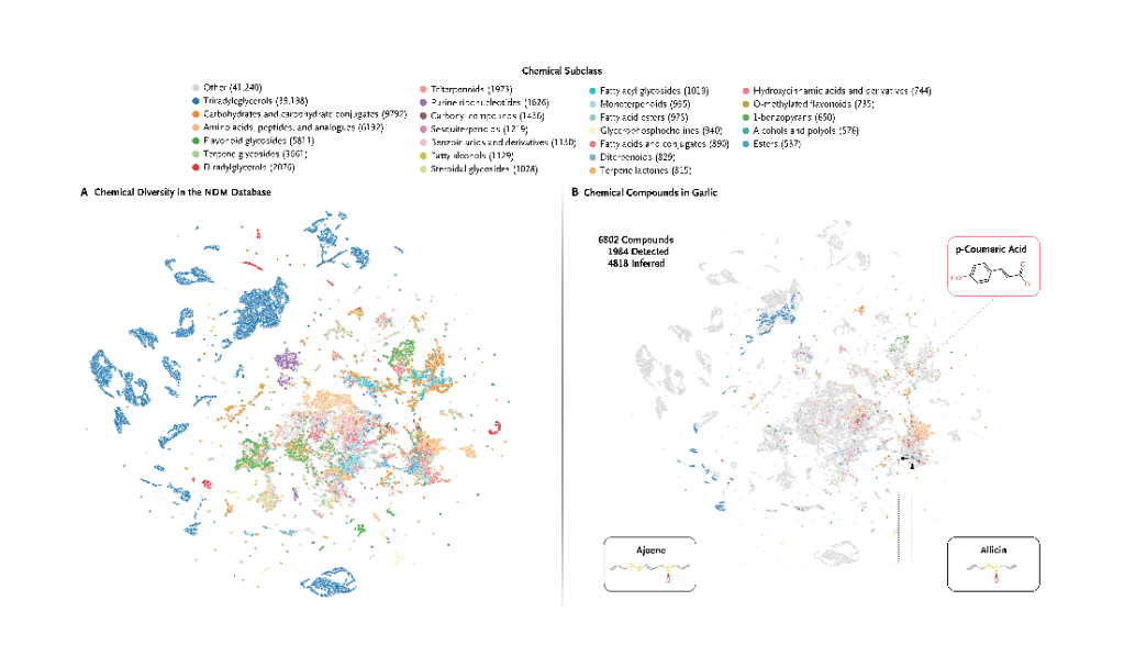 •Más de 139.000 moléculas presentes en los alimentos, denominadas “materia oscura nutricional” (NDM), encierran un potencial terapéutico inmenso y en gran medida sin explotar. •Las moléculas de los alimentos afectan a casi la mitad del proteoma humano y desempeñan un papel como moduladores amplios de los procesos biológicos. •Aproximadamente 2.000 moléculas de alimentos ya se utilizan como medicamentos, lo que pone de relieve la relevancia farmacéutica de los productos químicos alimentarios. •Las herramientas de inteligencia artificial (IA) avanzadas y los marcos de medicina en red podrían ayudar a los investigadores a decodificar la relevancia de la NDM para la salud y permitir predicciones de objetivos moleculares y mecanismos biológicos.•La falta de un mapeo sistemático de las sustancias químicas de los alimentos limita el progreso; se necesitan urgentemente financiación estratégica y enfoques escalables basados en inteligencia artificial. •El mapeo del NDM podría revolucionar la ciencia dietética y acelerar el descubrimiento de fármacos, lo que complementaría los logros del Proyecto Genoma Humano. A pesar del aumento de la inversión en investigación desde 2003 para caracterizar el contenido de moléculas pequeñas, 14-17 la gama completa de compuestos presentes en los alimentos sigue siendo en gran medida desconocida. En 2019, esta constatación nos llevó a acuñar el término «materia oscura nutricional», que destaca la gran cantidad de moléculas alimentarias que en gran medida no son rastreadas por las bases de datos de composición de alimentos ni por la investigación epidemiológica. 14,18 Desde entonces, hemos intensificado los esfuerzos para documentar sistemáticamente la presencia de moléculas pequeñas en los alimentos. Estos compuestos orgánicos de bajo peso molecular, cuya masa suele oscilar entre 50 y 1500 daltons, presentan características similares a las de los fármacos y a menudo sirven como sustratos o productos en procesos biológicos. 19Hemos catalogado 139.443 sustancias químicas en la biblioteca NDM, cada una identificada con un identificador químico internacional válido (InChIKey), distribuidas en más de 3000 alimentos comunes y 17.000 especies de la taxonomía del Centro Nacional de Información Biotecnológica. 20 La creación de este recurso requirió la agregación y desambiguación de datos de varios campos científicos, incluyendo anotaciones extraídas de una amplia gama de literatura especializada, 21 experimentos de espectrometría de masas no dirigidos, 22 y diversas bases de datos de composición. 23-25 Las predicciones genómicas y de vías contribuyeron a este esfuerzo integral. 26 La base de datos resultante proporciona identificadores químicos que vinculan las anotaciones a bibliotecas externas que van desde el Diccionario de compuestos alimentarios 24 a FooDB, 25 PhytoHub, 27 y las bases de datos del USDA, 28 por nombrar solo algunas.Los modelos de lenguaje químico como MoLFormer, 29 que representan cada molécula de alimento como un vector incrustado en un espacio de alta dimensión (768 dimensiones para MoLFormer), nos permiten visualizar las similitudes estructurales y funcionales de las moléculas de alimentos en la biblioteca NDM. Como se muestra en la Imagen 1A del gráfico interactivo , la biblioteca NDM contiene una amplia variedad de estructuras lipídicas que sirven como mensajeros intracelulares, incluyendo glicósidos terpénicos (3662), diacilgliceroles (2076), esteroides (2942) y esfingolípidos (258). El metabolismo secundario de las plantas también está bien representado, particularmente por la superclase química 30 de fenilpropanoides y policétidos (12,827), que incluye familias de compuestos conocidos como flavonoides (7624), isoflavonoides (1106), ácidos cinámicos (916), cumarinas (876), taninos (405) y estilbenos (340). Otras superclases están vinculadas al metabolismo secundario de las plantas, como los alcaloides (910), los lignanos y neolignanos (669) y los compuestos organosulfurados (547), lo que subraya la excepcional diversidad de los productos químicos que consumimos a diario.Pensemos en el ajo, un alimento básico en muchas cocinas y usado con fines medicinales durante miles de años, desde el antiguo Egipto. 31 La base de datos USDA SR Legacy enumera 69 nutrientes para el ajo crudo, pero no rastrea compuestos organosulfurados clave como la alicina 32 (responsable del aroma distintivo del ajo recién machacado) y el ajoeno, 33 ambos contribuyen a las propiedades cardioprotectoras y antimicrobianas del ajo. 34-37 Además, la base de datos no incluye el ácido p-cumárico, 38 un ácido hidroxicinámico que pertenece a la amplia clase de polifenoles y es conocido por sus efectos protectores contra la carcinogénesis y la inflamación. 39,40 Como hemos demostrado recientemente, 14 estos tres compuestos son solo una pequeña fracción de las 6802 pequeñas moléculas documentadas en el ajo crudo (Imagen 1B en el gráfico interactivo ), muchas de las cuales son metabolitos secundarios que sirven como defensa química de la planta contra el clima extremo y los depredadores.