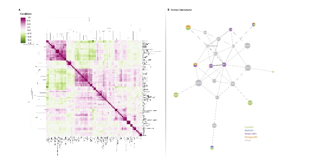 La amplia diversidad química de las moléculas de los alimentos y su función reguladora no metabólica plantean la pregunta: ¿qué parte del proteoma modulan? Este problema se representa en la Imagen 3 del gráfico interactivo , donde utilizamos node2vec para visualizar el interactoma humano 51,52 , un mapa subcelular que cataloga 354.659 interacciones físicas entre 18.659 proteínas humanas. Dado el gran número de interacciones, es imposible mostrar la red completa de forma legible. En cambio, el diseño de la figura refleja la red subyacente, con las proteínas que interactúan colocadas más cerca unas de otras que las proteínas que no interactúan. Lo que es más importante, la figura muestra todos los objetivos proteicos que tienen anotaciones de unión conocidas y validadas experimentalmente con moléculas pequeñas en la biblioteca NDM, 44 lo que indica que aproximadamente la mitad del interactoma (8997 proteínas) es el objetivo de las moléculas de los alimentos. Dado que solo el 6,45 % de las moléculas alimentarias de la biblioteca NDM presentan al menos una anotación de unión validada experimentalmente, es probable que la fracción real de proteínas moduladas por moléculas alimentarias sea mucho mayor. Sin embargo, existe una diferencia fundamental entre el papel de los fármacos y el de las moléculas alimentarias: en un momento dado, solo unas pocas proteínas son moduladas sustancialmente por los fármacos administrados en respuesta a una enfermedad. Por el contrario, las moléculas alimentarias influyen en la actividad de gran parte del proteoma a lo largo de la vida, y la variabilidad individual depende de las decisiones dietéticas (cantidad de alimento ingerido, momento de la ingestión, composición de la matriz, otros alimentos coingeridos, etc.).Aunque los fármacos y los compuestos dietéticos comparten características como moléculas pequeñas, los objetivos proteicos de los fármacos son altamente específicos, ya que son seleccionados o diseñados para limitar las asociaciones y mitigar los posibles efectos secundarios. Los compuestos naturales en los alimentos tienen mayor diversidad estructural y promiscuidad, lo que les permite unirse a una amplia gama de objetivos. Para abordar estos desafíos, recurrimos a la medicina de redes, 52,53 que define las enfermedades como cambios localizados en las redes de interacción subcelular. Identificamos el efecto relativo de un fármaco o una molécula de alimento en el interactoma midiendo el tamaño del subgrafo más grande de proteínas interactuantes diana por la misma sustancia química. 54,55 Aquí, nos centramos en las moléculas anotadas simultáneamente tanto por la biblioteca NDM como por DrugBank (1853 moléculas), ofreciendo una evaluación más imparcial al informar la bioactividad de las moléculas de alimentos que han recibido tanta atención científica como la prestada a las moléculas de los fármacos. Encontramos que, en promedio, los subgrafos generados por los objetivos de las moléculas de alimentos conectan 24,44 objetivos. Esto es 2,89 veces mayor que el número de proteínas interactuantes diana de las moléculas encontradas en DrugBank que no tienen su origen en los alimentos, que es de tan solo 8,47 (valor P de Mann-Whitney: 3,35 × 10 −41 ; tamaño del efecto: 0,14). La mayor vecindad del interactoma modulada por moléculas individuales de alimentos refleja su efecto molecular más amplio, que no puede interpretarse fácilmente a través del estrecho enfoque que se suele aplicar en el diseño de fármacos. Las moléculas de alimentos actúan como moduladores promiscuos de las redes moleculares celulares, influyendo simultáneamente en múltiples procesos y vías.Además, las moléculas de los alimentos, a diferencia de los fármacos, entran en contacto con el interactoma no de forma aislada, sino junto con otras moléculas alimentarias que suelen ser interdependientes. Estas interdependencias se muestran en la Imagen 4A del gráfico interactivo , que muestra la matriz de correlación de Spearman de las concentraciones químicas medidas para 108 frutas y verduras crudas con concentraciones catalogadas por el USDA en múltiples alimentos. Observamos grupos distintos de compuestos altamente correlacionados que a menudo reflejan vías compartidas en el metabolismo vegetal. Por ejemplo, la vitamina K 1 y la luteína, que tienen una diferencia de al menos un orden de magnitud en sus concentraciones promedio, 12 muestran una fuerte correlación debido a su vía biosintética compartida y a su precursor común, el pirofosfato de geranilgeranilo. Por el contrario, la delfinidina, una antocianidina, pertenece a un grupo separado, lo que indica la ausencia de una vía biosintética compartida. Estos hallazgos sugieren que muchas moléculas alimentarias producidas conjuntamente por el metabolismo de un organismo comparten características estructurales y funcionales, y a menudo se dirigen a las mismas áreas del interactoma humano. Las antocianidinas y las antocianinas, por ejemplo, difieren únicamente en la unión de las moléculas de azúcar. Su presencia en los alimentos muestra una fuerte correlación de Spearman, que oscila entre 0,4839 y 0,7283, y también modulan una vecindad común del interactoma mediante la acción de 10 dianas proteicas compartidas (Imagen 4 del gráfico interactivo ).