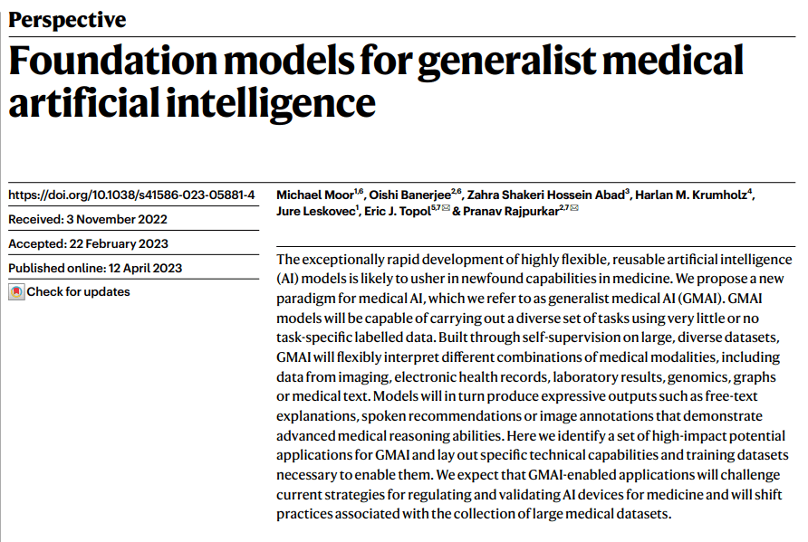 Los modelos básicos tienen el potencial de transformar la atención médica. La clase de modelos básicos avanzados que hemos descrito, GMAI, analizará de manera intercambiable múltiples modalidades de datos, aprenderá nuevas tareas sobre la marcha y aprovechará el conocimiento del dominio, lo que ofrece oportunidades en una gama casi ilimitada de tareas médicas. La flexibilidad de GMAI permite que los modelos sigan siendo relevantes en nuevos entornos y sigan el ritmo de las enfermedades y tecnologías emergentes sin necesidad de volver a capacitarlos constantemente desde cero. Las aplicaciones basadas en GMAI se implementarán tanto en entornos clínicos tradicionales como en dispositivos remotos como teléfonos inteligentes, y predecimos que serán útiles para diversas audiencias, lo que permitirá aplicaciones tanto para médicos como para pacientes.