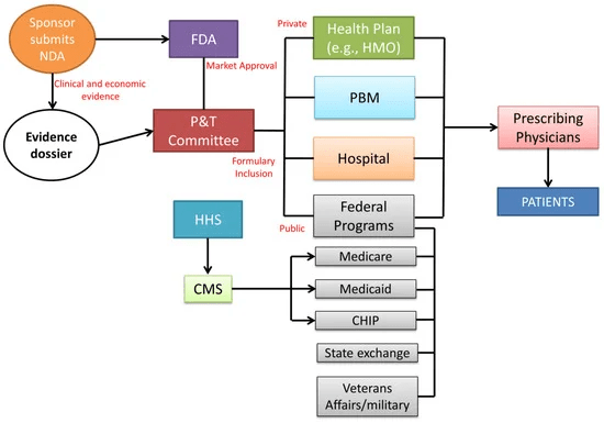 La función principal de la FDA es llevar a cabo la evaluación de productos farmacéuticos y médicos al garantizar la seguridad y eficacia de los medicamentos humanos, productos biológicos y dispositivos médicos antes y durante su comercialización. En particular, los expedientes de los productos son evaluados por el Centro de Evaluación e Investigación de Medicamentos (CDER) de la FDA. La empresa debe preparar un expediente exhaustivo que es evaluado por el CDER para determinar si el medicamento está listo para el uso público y si el fabricante puede solicitar una solicitud de nuevo medicamento (NDA) para introducir el medicamento en el mercado estadounidense. Después de la aprobación de la FDA, el fabricante presenta la evidencia clínica y económica al comité de farmacia y terapéutica (P&T) para su consideración en el formulario. Compuesto por farmacéuticos y médicos, el comité examina los expedientes de medicamentos, teniendo en cuenta los costos de adquisición de medicamentos y el posible impacto presupuestario. La inclusión en el formulario influye en los tomadores de decisiones de atención médica posteriores (planes de salud, administradores de beneficios de farmacia [PBM], hospitales y agencias gubernamentales) para permitir el reembolso y/o la colocación en el formulario de un nuevo medicamento, terapia o nueva formulación de un producto existente [