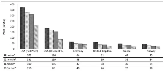 18 ]. Sin embargo, aunque el proceso de reembolso se aplica en el mercado estadounidense, el precio de los productos farmacéuticos es más caro en comparación con otros países industrializados. Entre los cuatro medicamentos analizados en