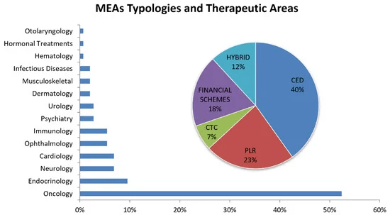 Más del 50% de los acuerdos se han aplicado a terapias contra el cáncer, seguido de endocrinología con un 9,5% y neurología con un 6,8%. La principal aplicación de las políticas de contención de costos, como los MEA, se encuentra en el área oncológica, donde los ciclos de tratamiento únicos pueden ser muy costosos y, al mismo tiempo, los datos clínicos en el momento de la aprobación del mercado suelen ser inadecuados o no lo suficientemente exhaustivos para describir a fondo su eficacia y rentabilidad.En cuanto a los tipos de MEA, más de un tercio de los acuerdos son CED (40 %), seguidos de PLR (23 %), esquemas financieros (18 %), híbridos (12 %, en particular: PLR–CTC, CED–PLR, PLR esquemas financieros, PLR–CTC–esquemas financieros, CED–PLR–esquemas financieros) y CTC (7%). CED y PLR son los esquemas más empleados (más del 60% de los MEA examinados) debido a la cobertura de productos farmacéuticos para los cuales datos adicionales, recopilados en el contexto de la atención clínica y con cierto grado de incertidumbre, aclararían aún más en términos de impacto en la salud de los pacientes en el mundo real. En particular, los esquemas de PLR ayudan en la gestión de nuevas terapias de entrada al verificar los objetivos de tratamiento a corto plazo para pacientes individuales (por ejemplo, una lista de criterios de valoración clínicos). En caso de resultados negativos, los fabricantes deben cubrir el costo reembolsando al pagador, o cubriendo la misma cantidad de costos para otro paciente. De esta forma, los productos farmacéuticos que no convencieron del todo a los pagadores y organismos sanitarios pueden tener la oportunidad de comercializarse y, a pesar de su alto precio, también pueden ser accesibles a los pacientes gracias a los acuerdos de reembolso establecidos por los servicios nacionales de salud. Las fases de comercialización de productos farmacéuticos en los EE. UU. y en Europa no son fáciles de comparar, debido a los diferentes procesos y diferentes pasos de decisión que adoptan los países europeos antes de que se autorice una nueva terapia para estar en el mercado, con la relativa fase de precio y reembolso. Ferrario y Kanavos [ y a pesar del alto precio, también pueden ser accesibles para los pacientes debido a los acuerdos de reembolso establecidos por los servicios nacionales de salud. Las fases de comercialización de productos farmacéuticos en los EE. UU. y en Europa no son fáciles de comparar, debido a los diferentes procesos y diferentes pasos de decisión que adoptan los países europeos antes de que se autorice una nueva terapia para estar en el mercado, con la relativa fase de precio y reembolso. Ferrario y Kanavos [ y a pesar del alto precio, también pueden ser accesibles para los pacientes debido a los acuerdos de reembolso establecidos por los servicios nacionales de salud. Las fases de comercialización de productos farmacéuticos en los EE. UU. y en Europa no son fáciles de comparar, debido a los diferentes procesos y diferentes pasos de decisión que adoptan los países europeos antes de que se autorice una nueva terapia para estar en el mercado, con la relativa fase de precio y reembolso. Ferrario y Kanavos [ con la relativa fase de tarificación y reembolso. Ferrario y Kanavos [ con la relativa fase de tarificación y reembolso. Ferrario y Kanavos [