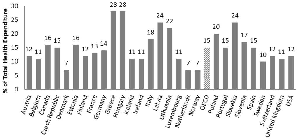 Figura 1 ). En 2019, se confirmó que Dinamarca era el país con la clasificación más baja en términos de gasto farmacéutico per cápita, pero en la dirección opuesta, Suiza redujo el gasto farmacéutico per cápita a USD 826, y Alemania tuvo los gastos más altos, que oscilaron entre USD 756 y USD 880.El gasto farmacéutico es una de las partidas de gasto más importantes dentro de los costes sanitarios, representando entre el 7% (Dinamarca, Países Bajos, Noruega) y el 28% (Hungría y Grecia) del gasto sanitario total en 2019 (Figura 2
