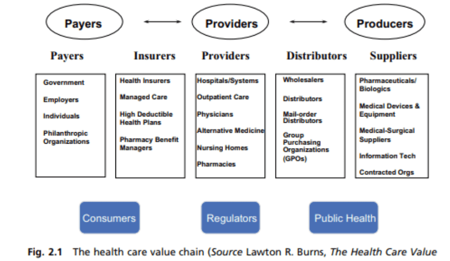 La figura 2.1 muestra la atención médica de los Estados Unidos como una cadena vertical de compradores y proveedores (en una vista lateral). Cualquier casilla a su derecha es un posible proveedor ascendente; Cualquier caja a su izquierda es un potencial comprador descendente. Michael Porter, economista de la Escuela de Negocios de Harvard, popularizó el término cadena de valor entre los círculos académicos para abarcar toda la cadena vertical, desde la entrada de materias primas hasta la salida del producto final consumido por el usuario final.8