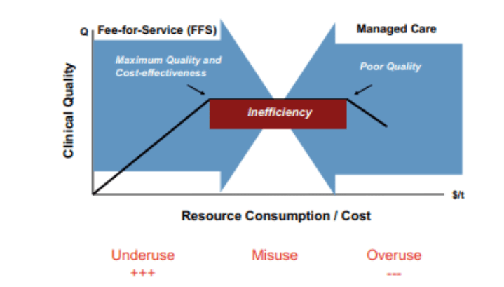 Esta curva refleja tres tipos de medidas de calidad del proceso: subutilización, mal uso y uso excesivo. La pendiente ascendente sugiere que el costo y la calidad se correlacionan positivamente para una variedad de servicios que están subutilizados, como vacunas, tomar medicamentos recetados (por ejemplo, estatinas o betabloqueantes para enfermedades cardíacas), atención basada en pautas y atención preventiva y primaria. La pendiente descendente sugiere que el costo y la calidad están correlacionados negativamente para una gama diferente de servicios, como los antibióticos para infecciones simples, cuyo uso excesivo puede ser perjudicial. La parte plana en el medio sugiere que el costo y la calidad no están relacionados con otro conjunto de servicios, como las imágenes para el dolor lumbar.