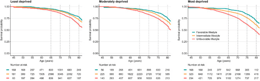 Durante un seguimiento medio de 7,4-12,7 años, 3381, 2382, 1281 y 577 pacientes con diabetes murieron antes de los 80, 75, 70 y 65 años, respectivamente. La alta privación socioeconómica mostró una asociación con un mayor riesgo de mortalidad prematura que fue parcialmente mediada por los estilos de vida generales. Se encontró una interacción significativa entre el estilo de vida y la privación en la mortalidad prematura, que se hizo más evidente a medida que disminuía la edad al morir. El cociente de riesgos instantáneos (HR) ajustado para la muerte antes de los 80 años al comparar el estilo de vida desfavorable con el favorable fue de 1,49 (IC del 95 %: 1,21-1,82) en el grupo menos desfavorecido y de 1,92 (IC del 1,56-2,36) en el grupo más desfavorecido. Los HR equivalentes para muerte antes de los 65 años fueron 1,33 (0,76-2,33) y 3,78 (2,04-7,02), respectivamente.